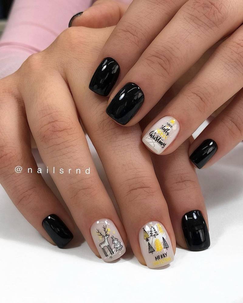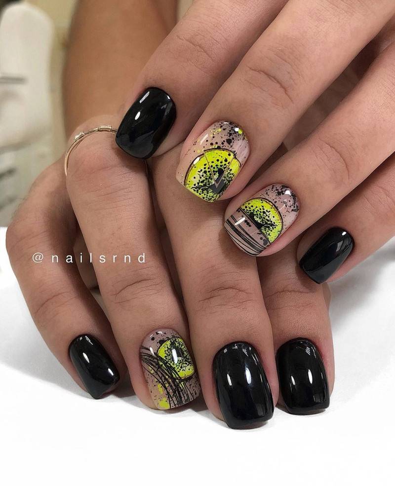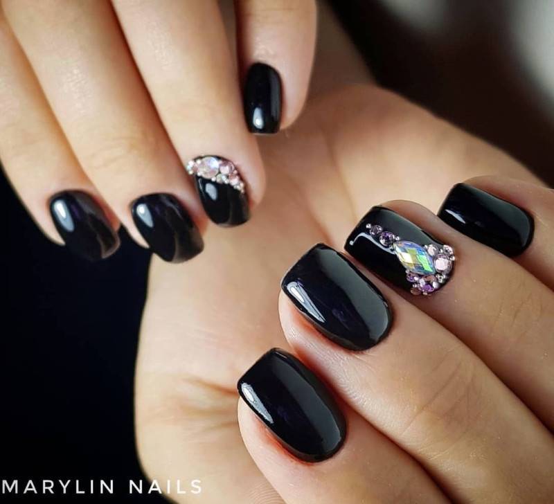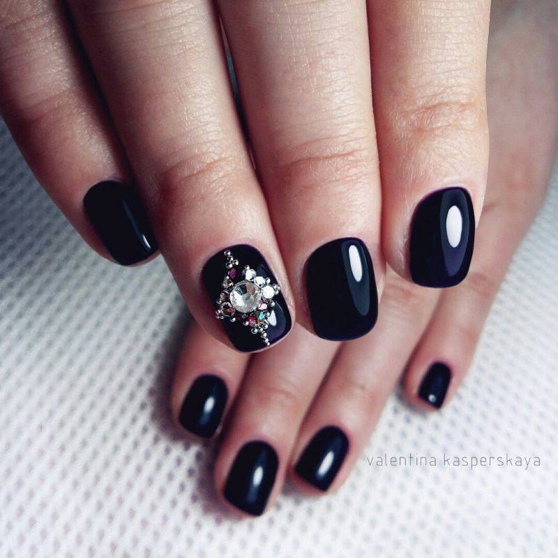 Учитывая моду на минимализм, самым актуальным будет однотон на коротких квадратных ногтях и миндале. Тем не менее дизайны в сочетании с черным цветом просто сногсшибательны, и мы вынуждены сделать исключение, и поддаться этим манящим рисункам и блестяшкам.