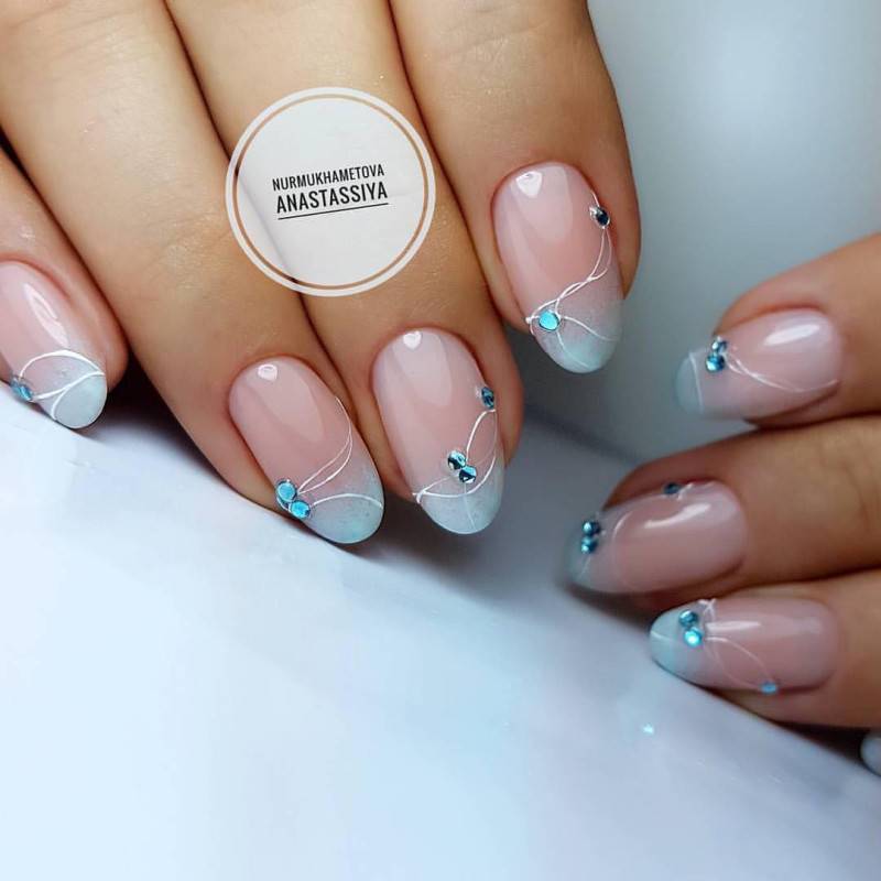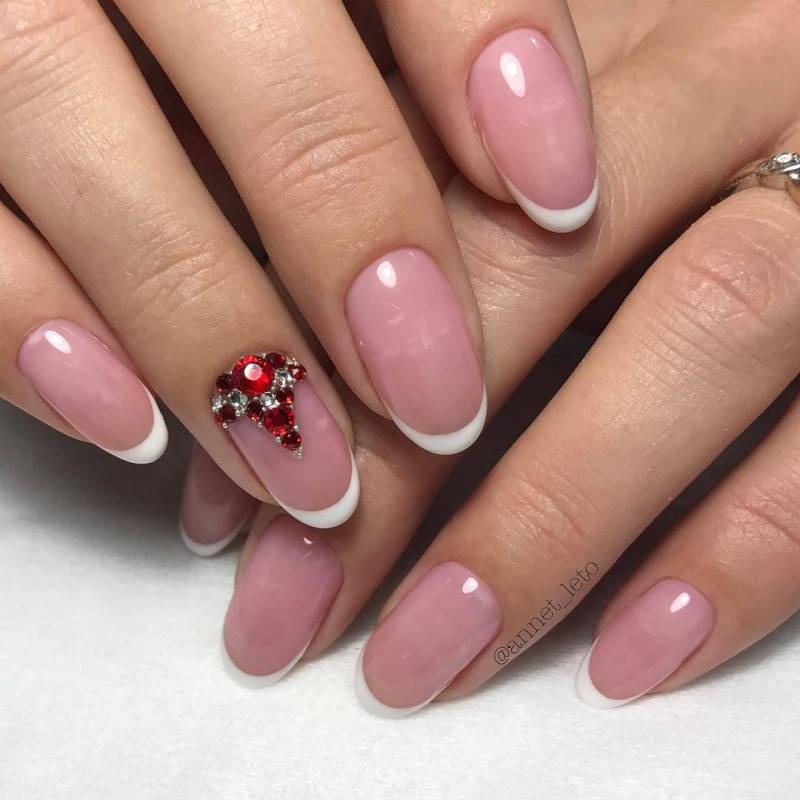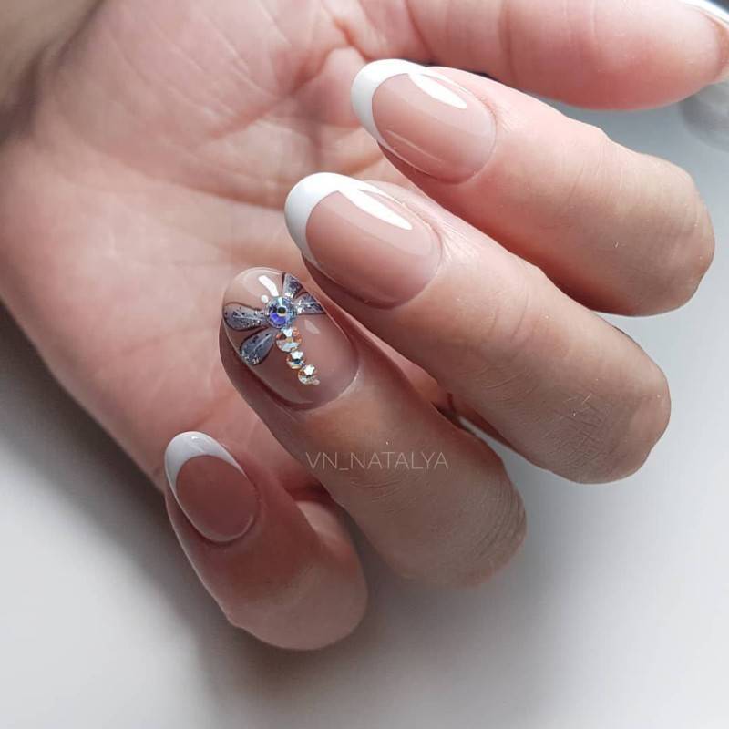 Вы можете использовать либо совсем маленькие блестки, либо довольно крупные стразы в общей композиции рисунка. Больше всего мастера нейл-арта любят украшать с помощью искусственных бриллиантов улыбку френча.