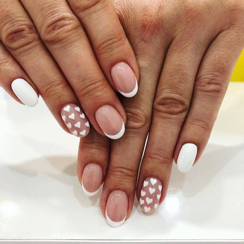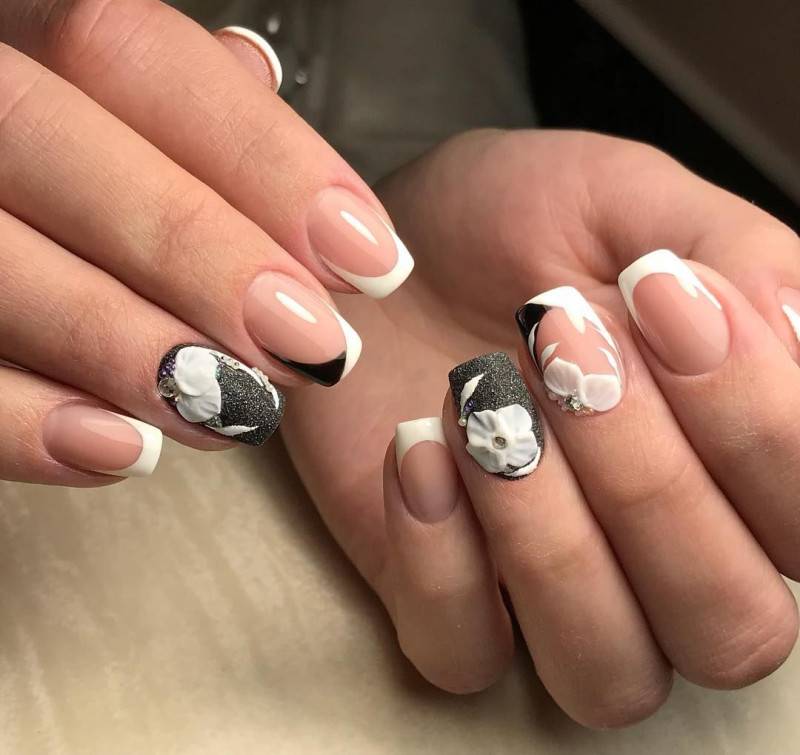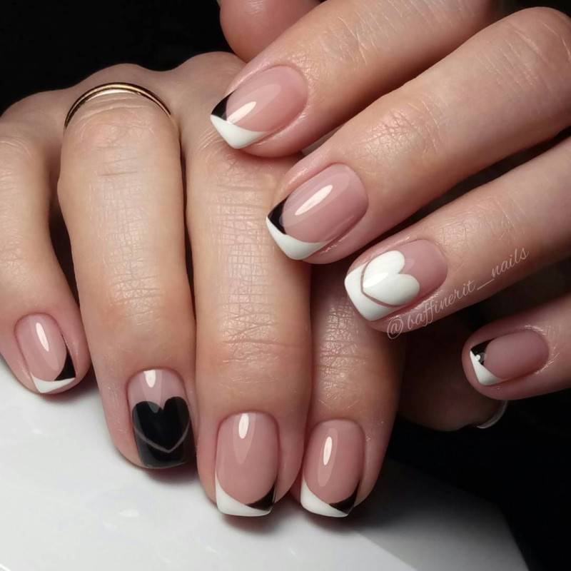 Черный и белый используются только для декора «улыбки» френча, остальное пространство ногтя покрывается прозрачным топом или светло-розовым цветом. «Улыбка» френча в черно-белом цвете отличается от классического варианта. Чтобы дизайн выглядел интересно, используйте двойную, смещенную, геометрическую форму «улыбки».