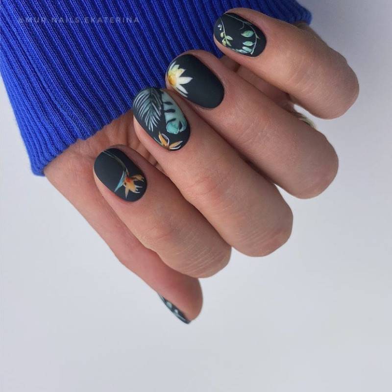 Очень популярны среди современных модниц матовые ноготки. Матовое покрытие считается настоящим трендом сезона. Бархатная поверхность такого маникюра роскошно выглядит при использовании тёмных оттенков. Чёрный цвет является идеальным решением для матового маникюра.