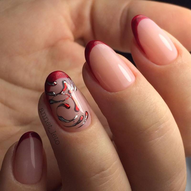 Модницам быстро надоедает классика. Хочется чего-то яркого, но при этом такого же благородного, как и бело-розовый френч. Отличный вариант, который будет уместен на торжественном событии, — микс черного или бордового оттенков с золотом или серебром. Это роскошное сочетание. Девушка с красивыми длинными пальцами и таким маникюром станет невероятно притягательным объектом для сильного пола.
