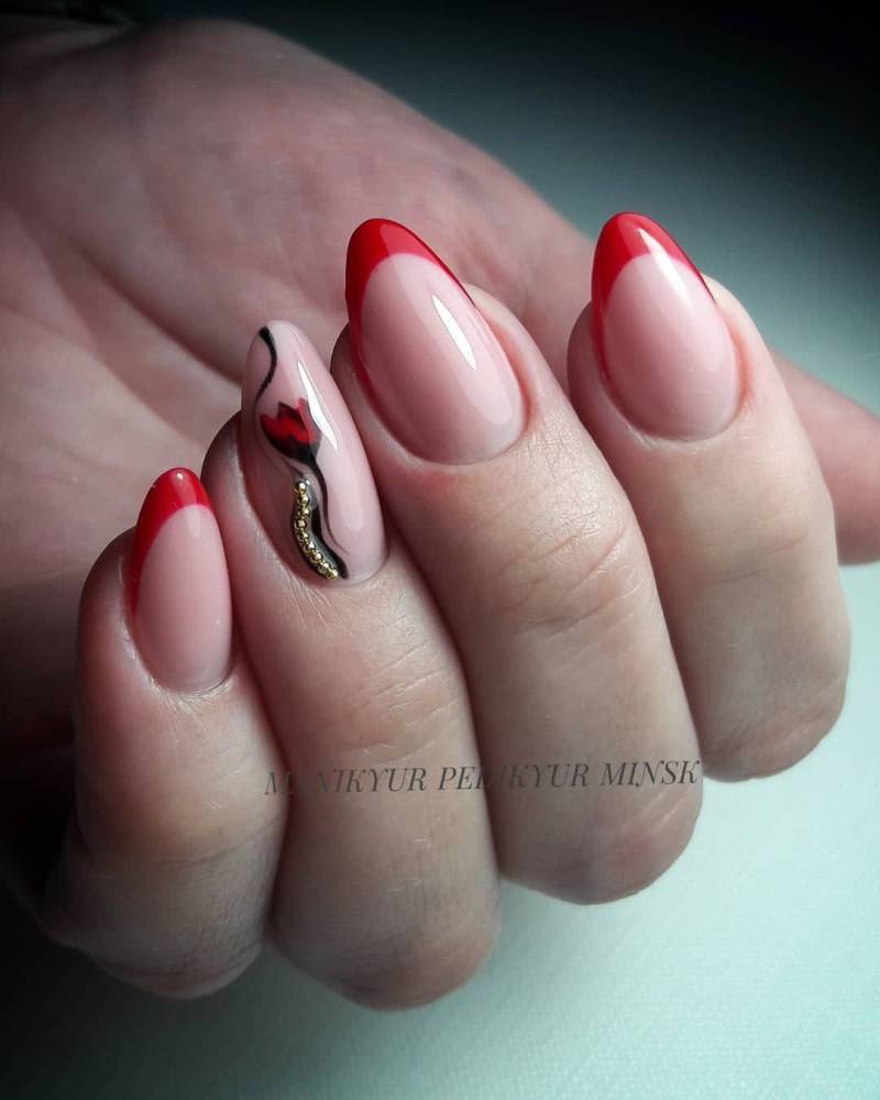 Но следите за дизайном и рисунком – он должен сочетаться с выбранным нарядом. Для романтического свидания можно сделать классический френч из красных и черных лаков, дополнив образец мелкими стразами. На каждый день любителям сочетать «страстные» цвета можно покрыть ноготь матовым красным цветом и провести тонкую черную линию в месте разделения края и основной части ногтя. Такая линия может быть ровной, а можно провести ее по всей длине как зигзаг.