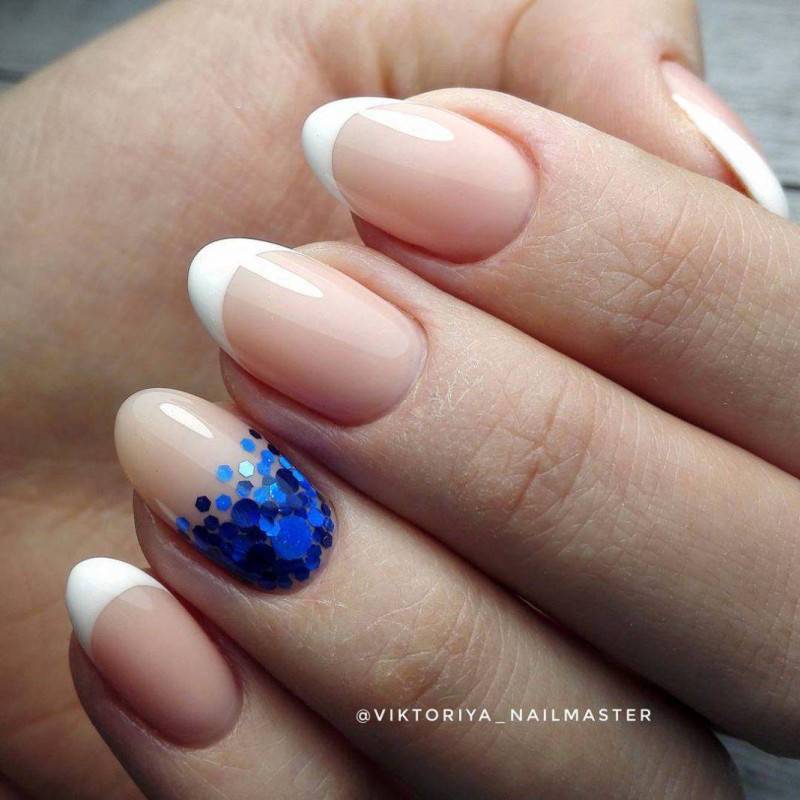 К примеру, разноцветный или жемчужный пигмент, который нанесён поверх оформления, даже в комбинации с бесцветной основой, делает классический френч более интересным, свежим и невесомым.