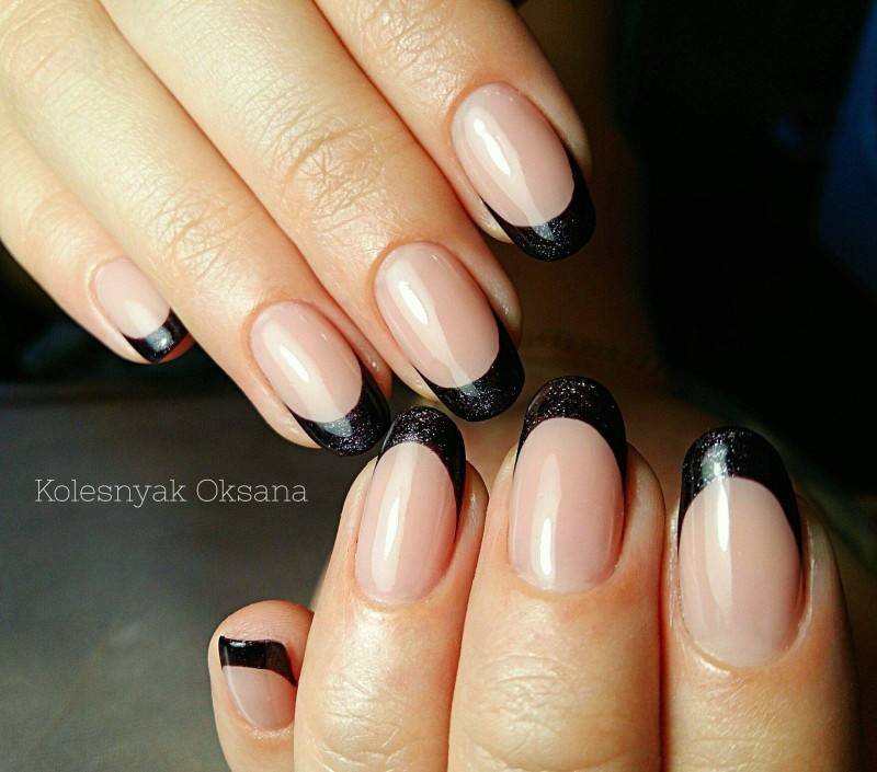 Лучше всего черный французский маникюр подходит обладательницам длинных, а также ногтям средней длины. Объясняется это вполне элементарно: лак этого цвета визуально уменьшает размеры не только в одежде. И если нанести темный лак на узкую полоску ногтя, он станет еще меньше и нужный эффект достигнут не будет. Такой французский маникюр хорошо смотрится на всех формах, начиная от классической овальной и заканчивая экстравагантной треугольной.