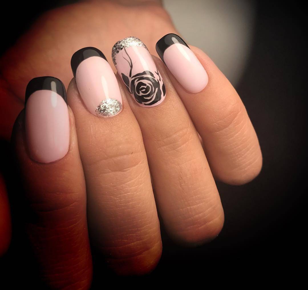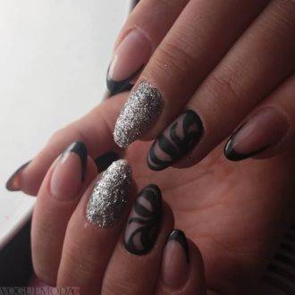 Модницам быстро надоедает классика. Хочется чего-то яркого, но при этом такого же благородного, как и бело-розовый френч. Отличный вариант, который будет уместен на торжественном событии, — микс черного или бордового оттенков с золотом или серебром. Это роскошное сочетание. Девушка с красивыми длинными пальцами и таким маникюром станет невероятно притягательным объектом для сильного пола.