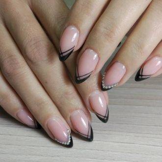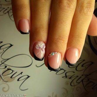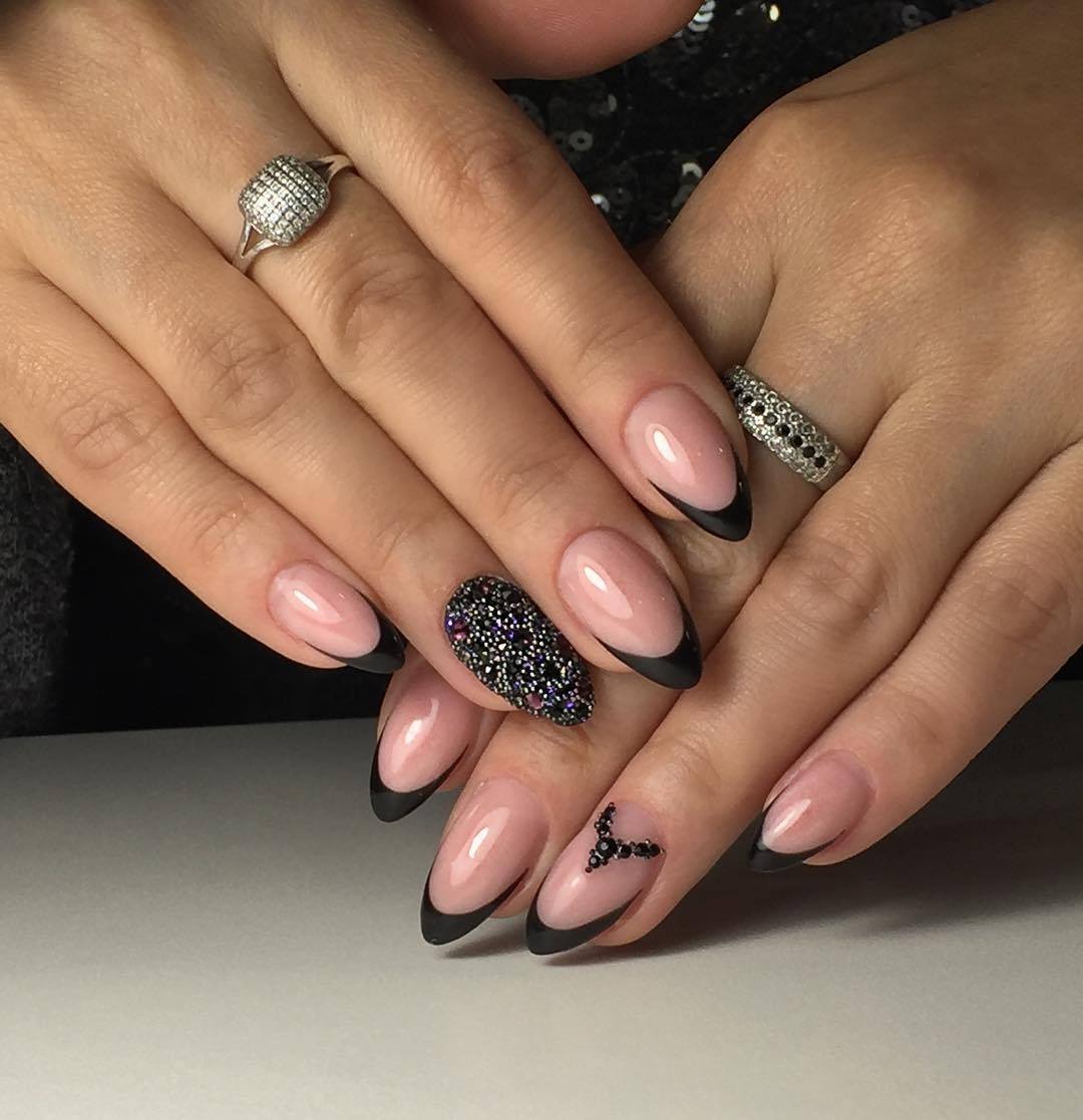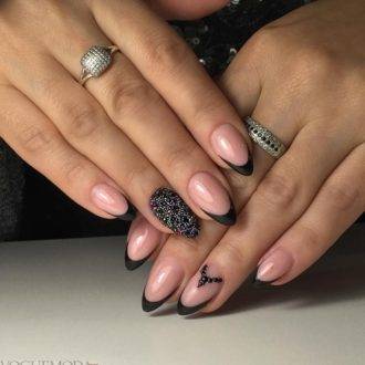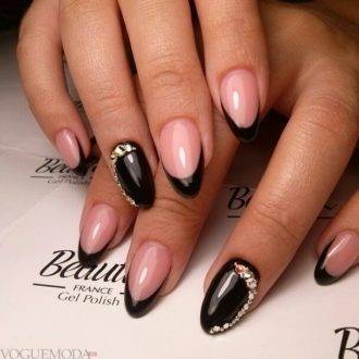 Черный френч на ногтях прекрасно сочетается со стразами. Главная заповедь такого маникюра – знать меру, ведь использование черных тонов в дизайне само по себе бросается в глаза.