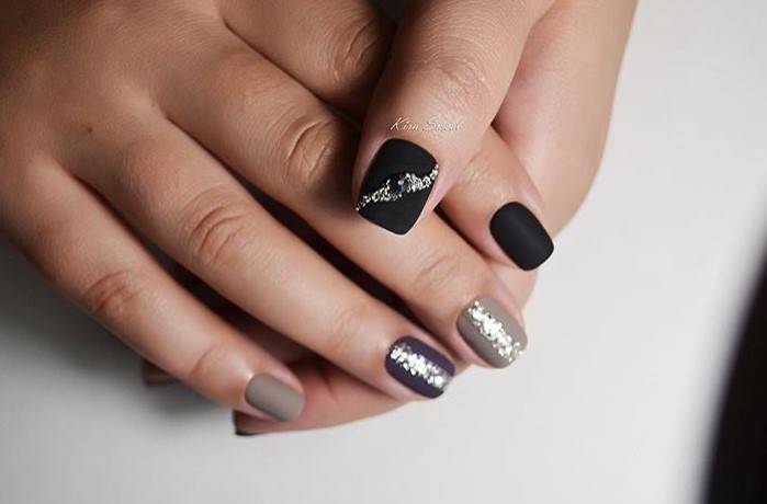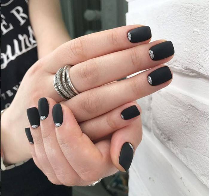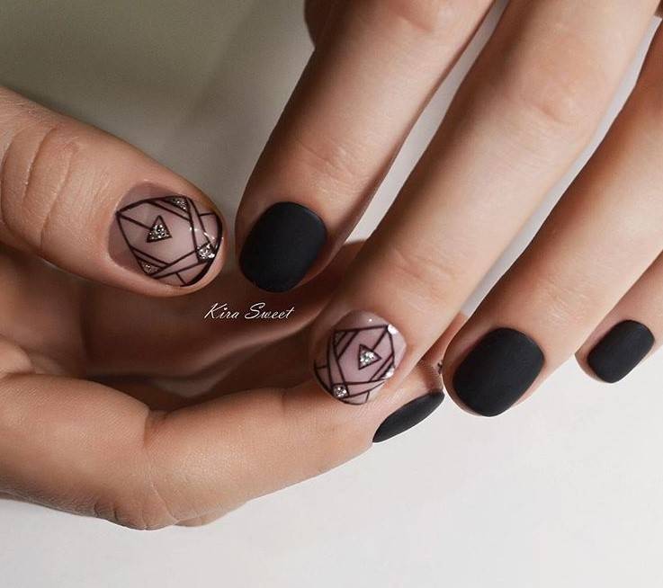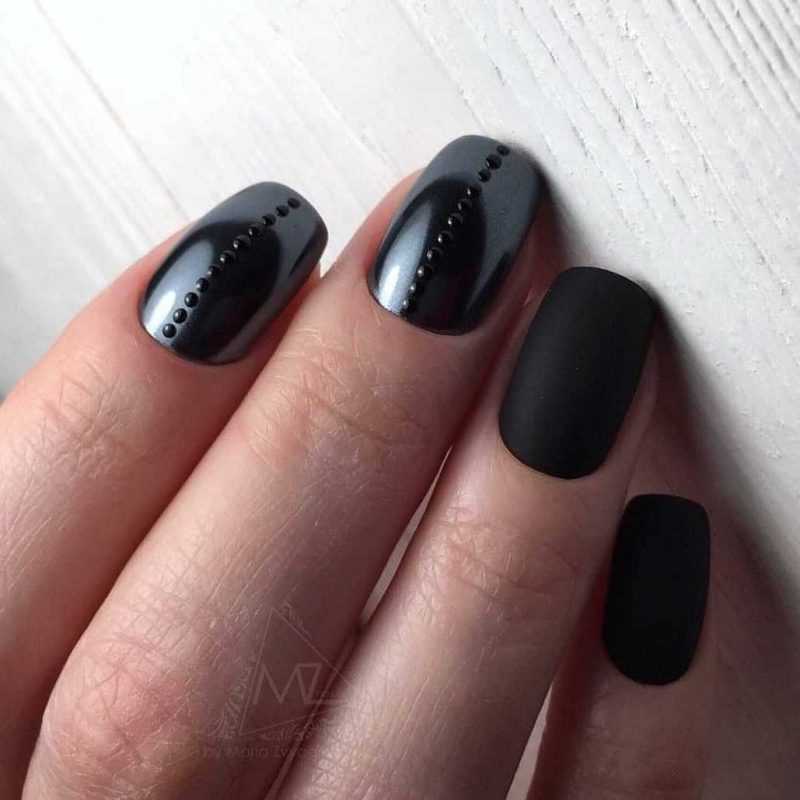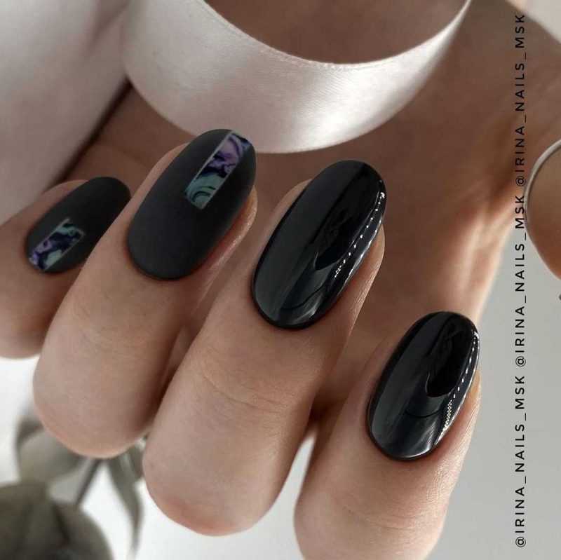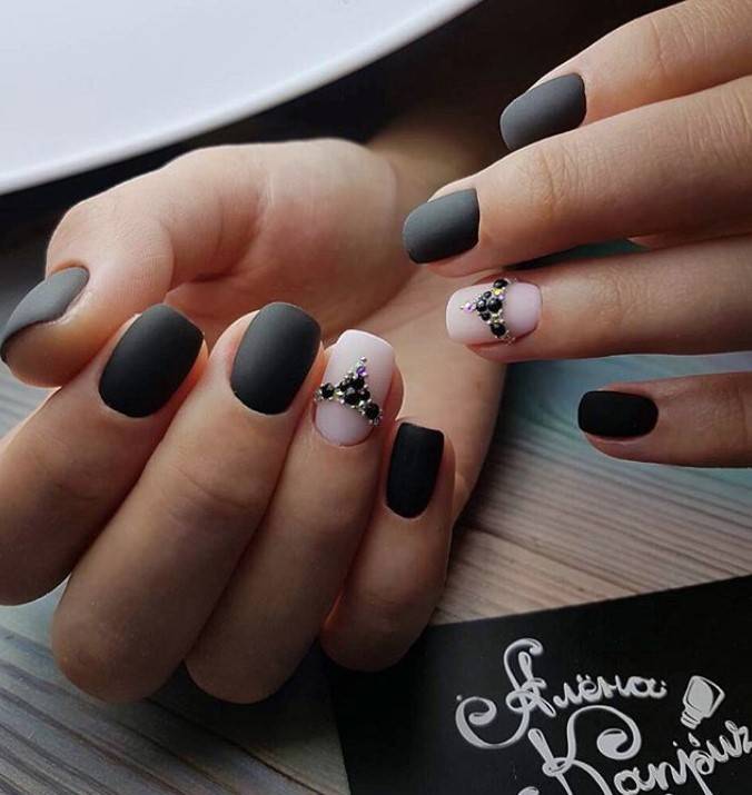 Чёрный маникюр с матовым эффектом придаст ноготкам изящности, утончённости. Чтобы такой маникюр смотрелся ещё красивее, его обычно дополняют глянцевым лаком чёрного цвета. Можно некоторые ноготки покрыть глянцем, а некоторые матовым лаком – выйдет очень оригинальный дизайн.