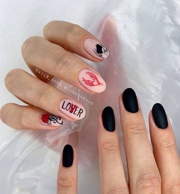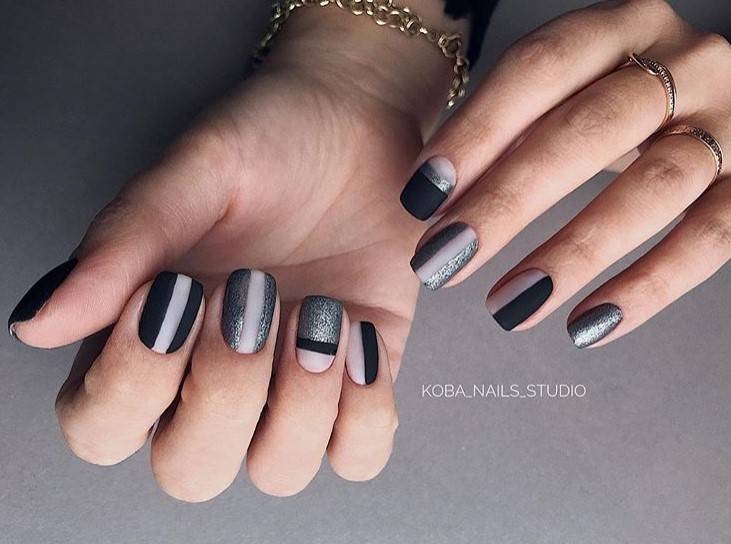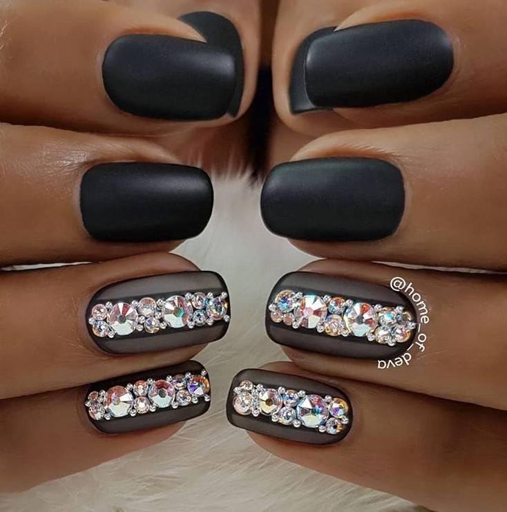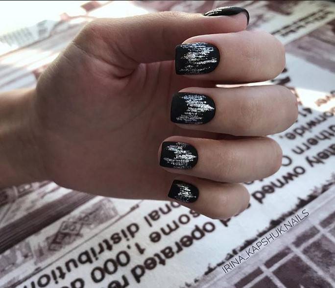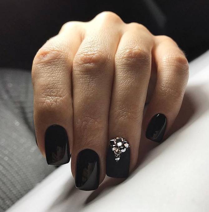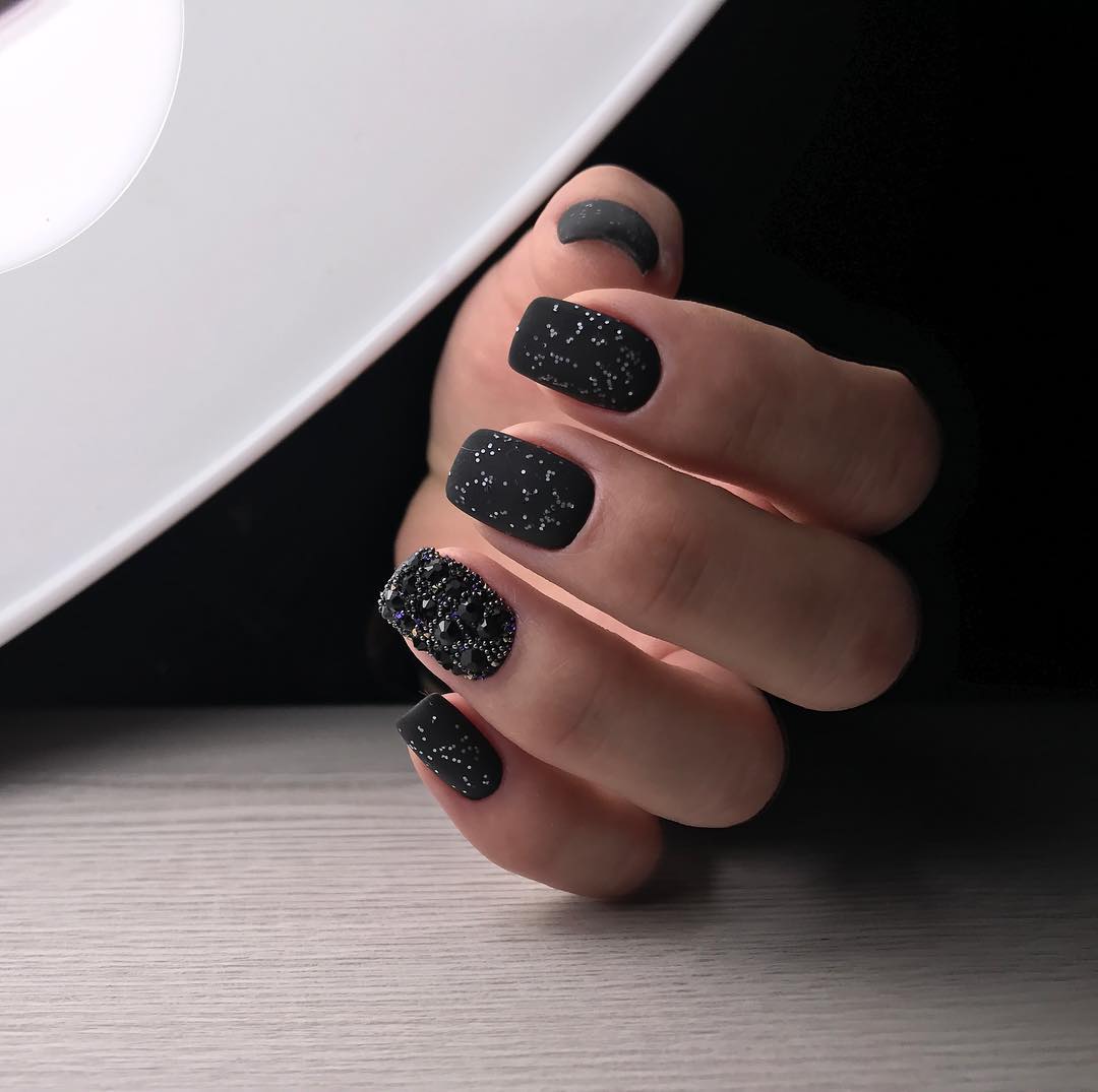 Чёрный маникюр с матовым эффектом придаст ноготкам изящности, утончённости. Чтобы такой маникюр смотрелся ещё красивее, его обычно дополняют глянцевым лаком чёрного цвета. Можно некоторые ноготки покрыть глянцем, а некоторые матовым лаком – выйдет очень оригинальный дизайн.