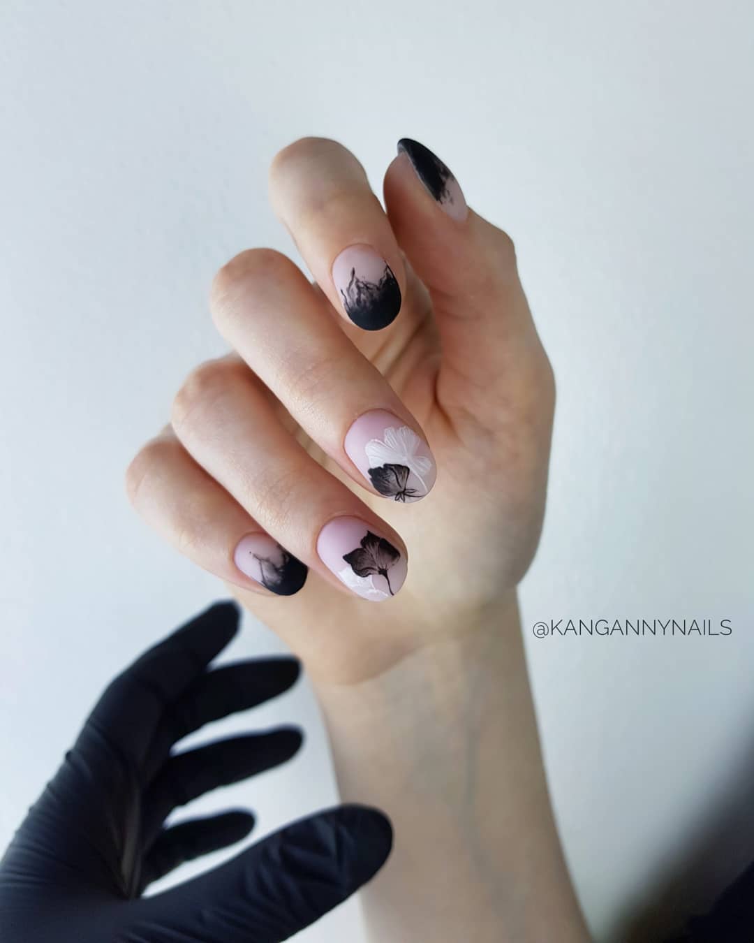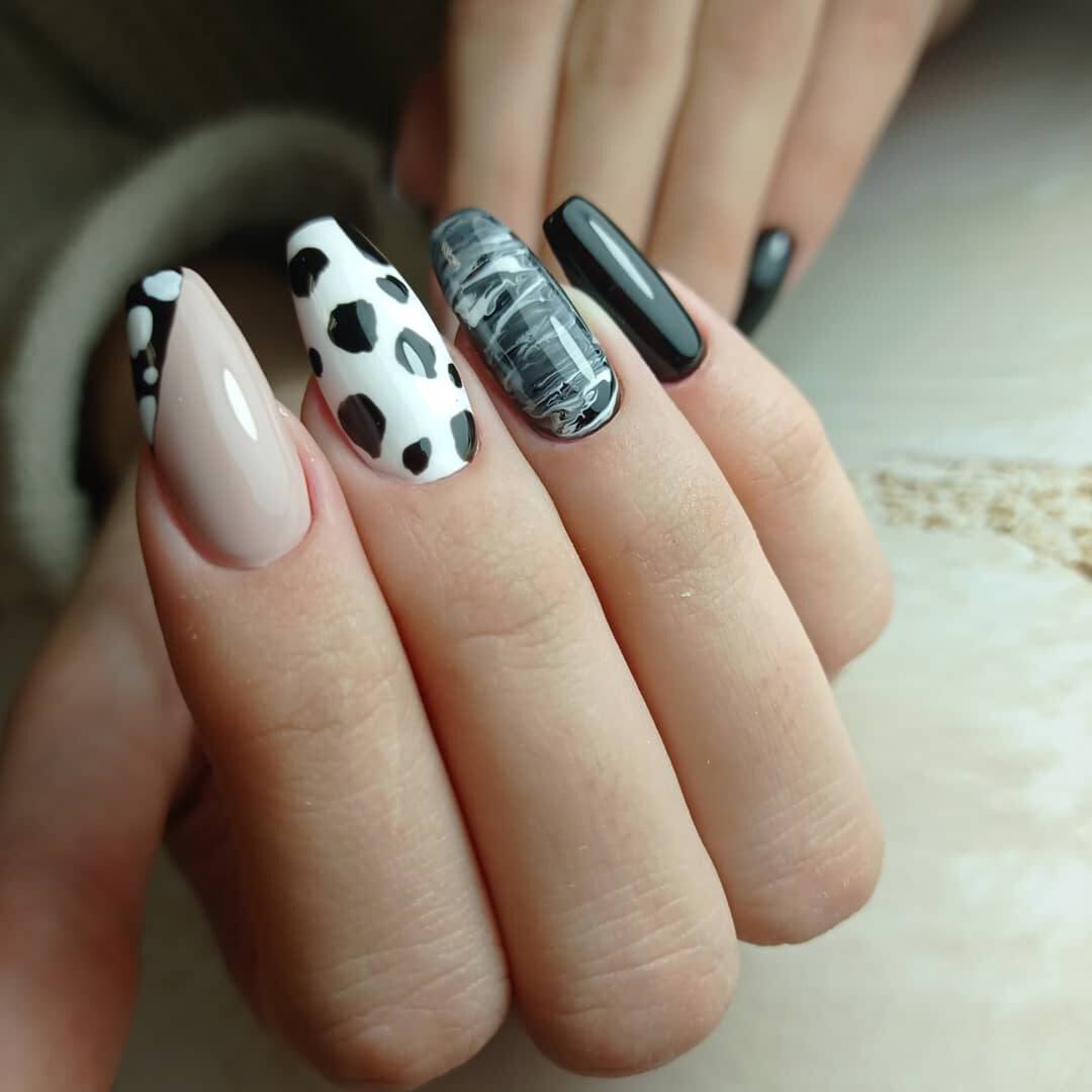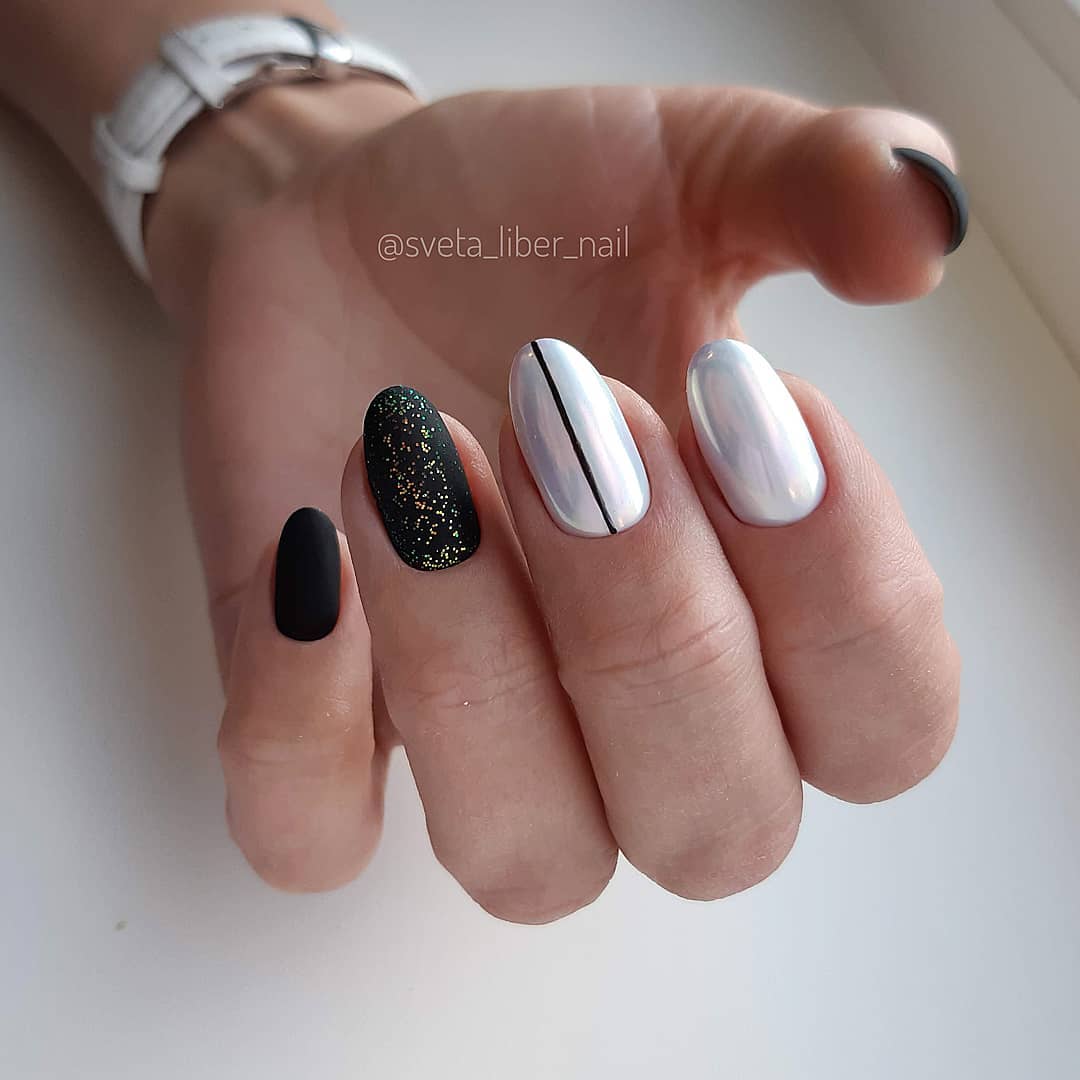 Контрастные нейл-арты всегда выглядят шикарно и завораживающе. Сложно представить себе более противоположные оттенки, чем глубокий черный и нежный белый, почти молочный цвет.
