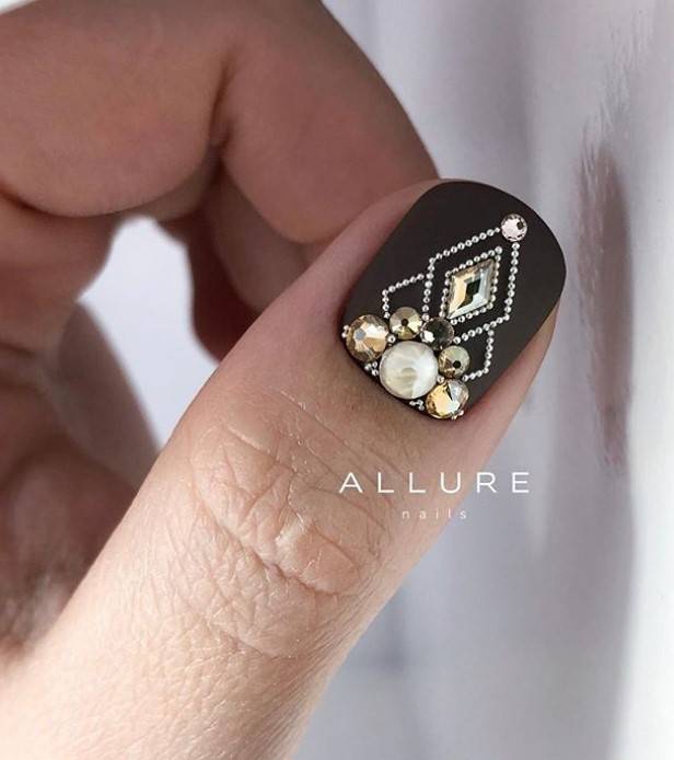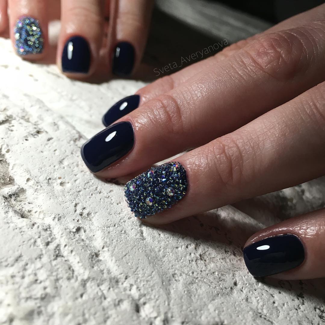 Стразы выбирают с осторожностью, они могут сильно перегрузить нейл арт и сделать его безвкусным. Для короткой длины больше подходят мелкие камушки — серебристого, белого и темных оттенков