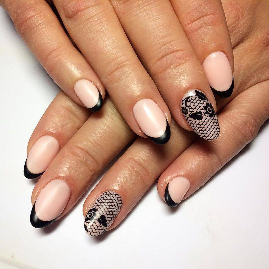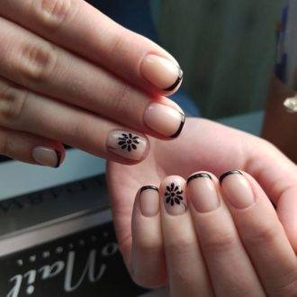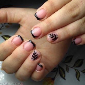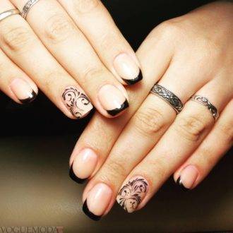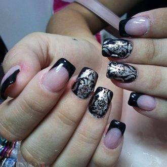 Прекрасно дополняют черный френч различные рисунки. В 2018 году мастера нейл-арта любят воплощать на ноготках цветочные мотивы, кружева, вензеля и листья. Все эти тренды идеально впишутся в тематику френча. Популярная техника с рисунками заключается в том, что на темной улыбке рисуют светлой кистью, потом продолжают этот мотив темным лаком на нейтральной основе.