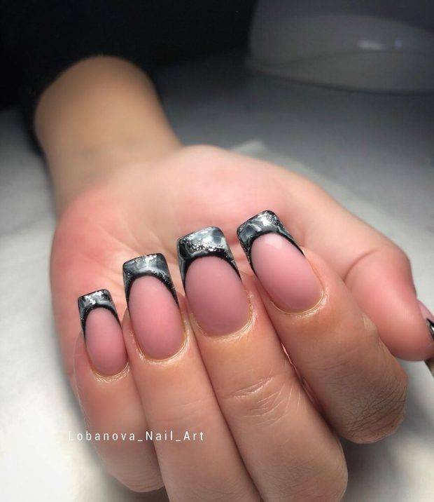 Роскошь матового маникюра безупречна во французском маникюре. По праву самым интересным и загадочным вариантом будет черная матовая основа в сочетании с глянцевой улыбкой.