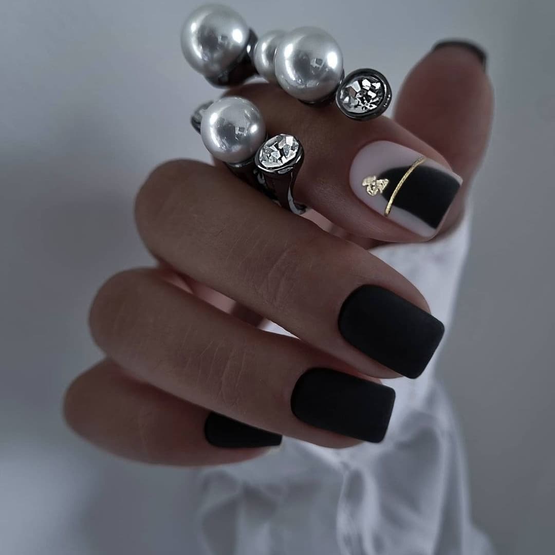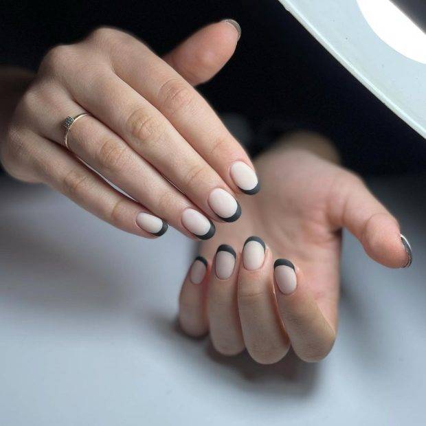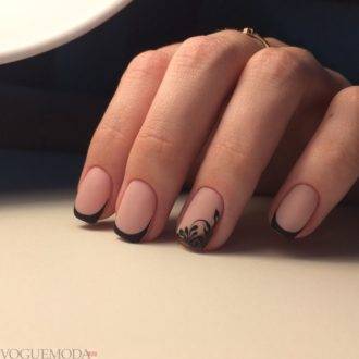 Красиво будет выглядеть чёрный французский маникюр с матовым ноготком и глянцевым краешком.