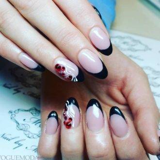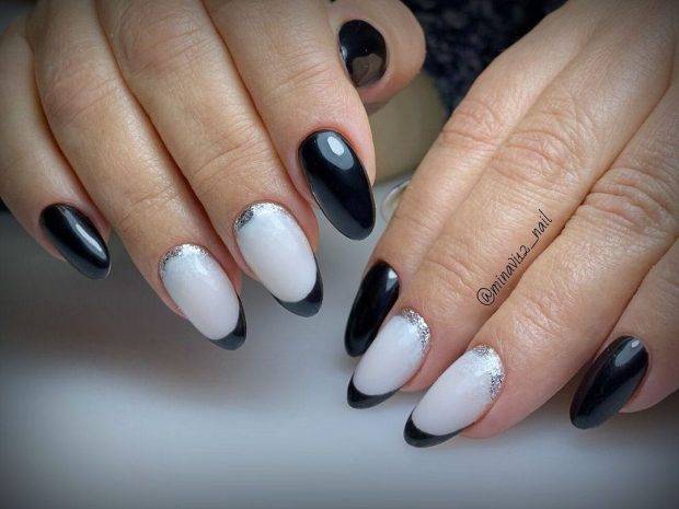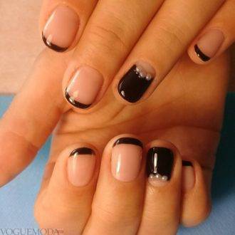 Не исключены и классические варианты френча в черно-белом цвете, когда черным покрывается вся ногтевая пластина, а белым прорисовывается линия «улыбки».