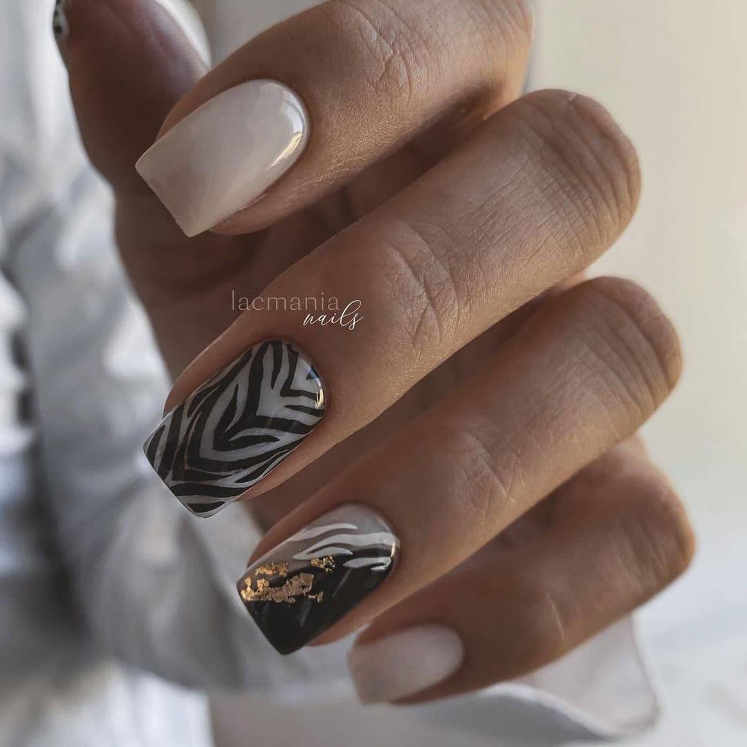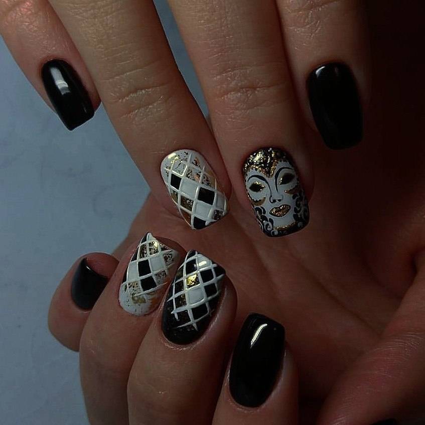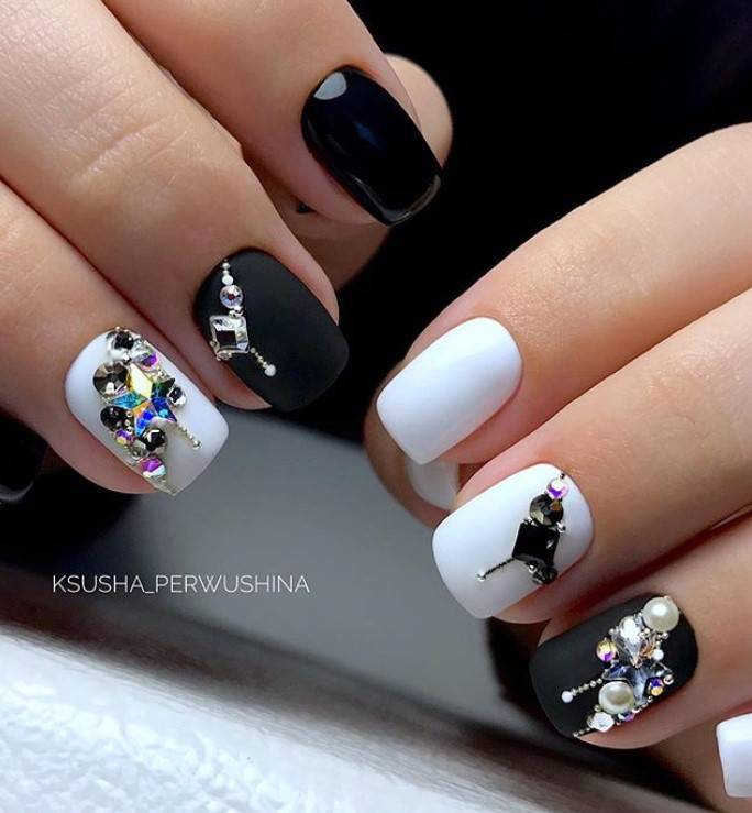 Когда речь идет о сочетаниях черного и других цветов в маникюре, то первой возникает ассоциация с очень эффектным и беспроигрышным сочетанием черного и белого. Игра контрастов дает несметное количество разнообразнейших креативных сочетаний: полоски, клеточки, горошек, геометрия, абстракция, мраморные узоры, французский и лунный маникюр, тематические принты, негативное пространство, эффектный градиент, минималистический дизайн, силуэтные рисунки, надписи черным на белом и наоборот, и многие другие. Самыми удачными и популярными в этом году также стали сочетания черного с нежным и женственным розовым и ярко-розовой и насыщенной фуксией, со всем спектром очень актуальной нюдовой палитры гель-лаков, классическим красным и его невероятными оттенками, а также мегамодным в этом году и в маникюре, и в одежде изумрудно-зеленым цветом лака и блестящих украшений, напоминающими драгоценный натуральный камень изумруд!