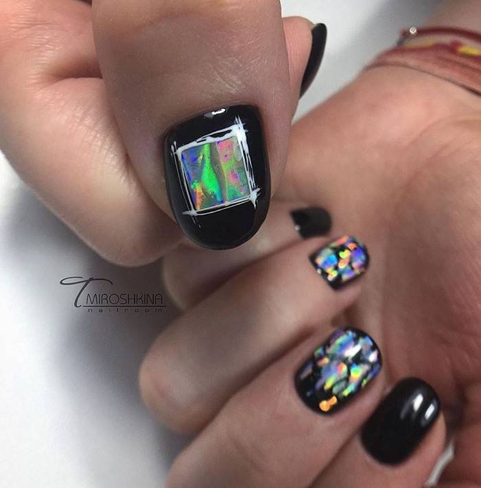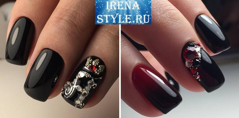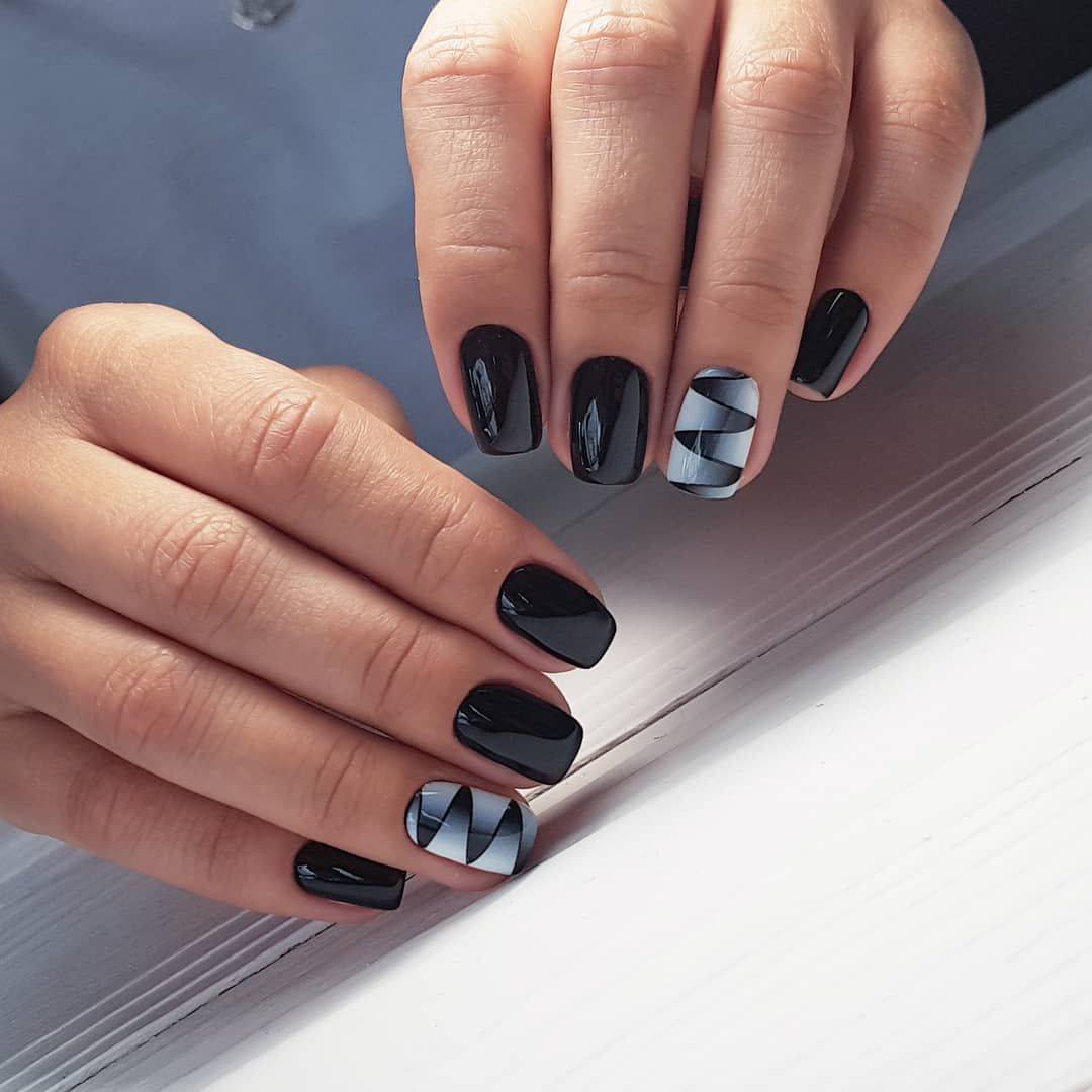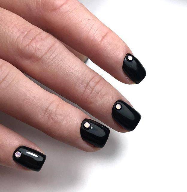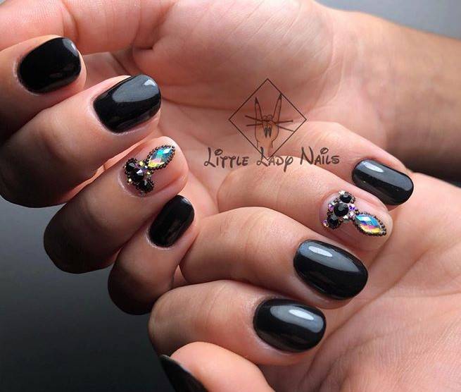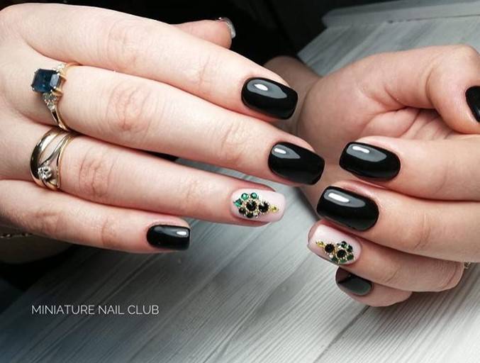 Учитывая моду на минимализм, самым актуальным будет однотон на коротких квадратных ногтях и миндале. Тем не менее дизайны в сочетании с черным цветом просто сногсшибательны, и мы вынуждены сделать исключение, и поддаться этим манящим рисункам и блестяшкам.