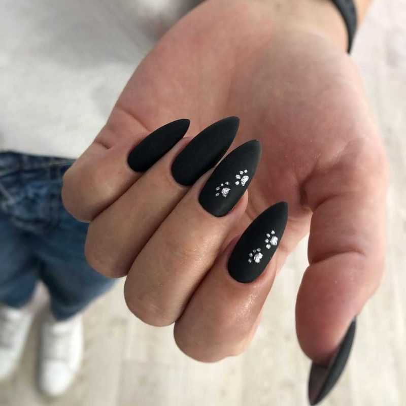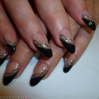 Обладательницам острых ногтей мы не станем советовать быть скромнее. Ведь скромницы не носят столь смелую форму. Как бы социум не относился к такой форме, никто не будет отрицать что черный цвет и острые ноготки просто созданы друг для друга. Черные ногти — это прекрасное поле для экспериментов. Пламенные рисунки, художественная роспись, камни, все это, на острой форме в черном цвете, просто завораживает.