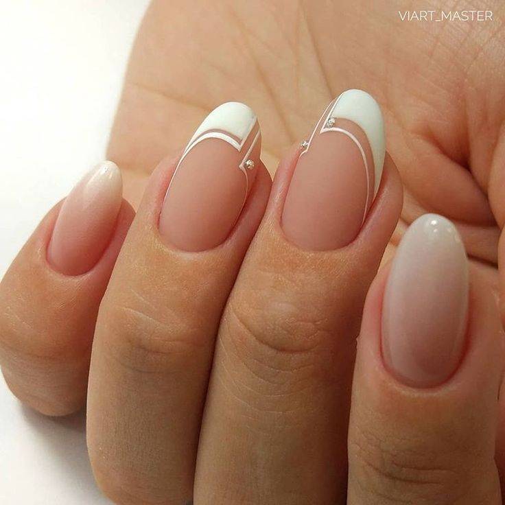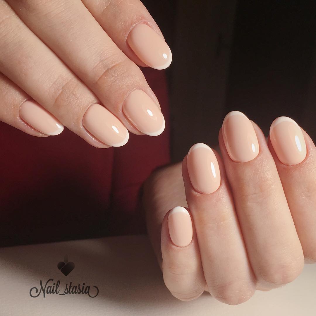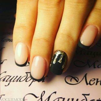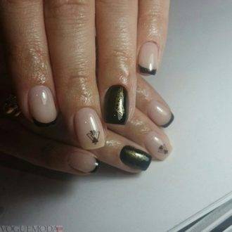 Актуален обычный классический вариант френча с темной — глянцевой или матовой — каймой. Если хотите сделать нейл арт индивидуальным, добавьте минималистичный рисунок — полоски, абстракцию и др.