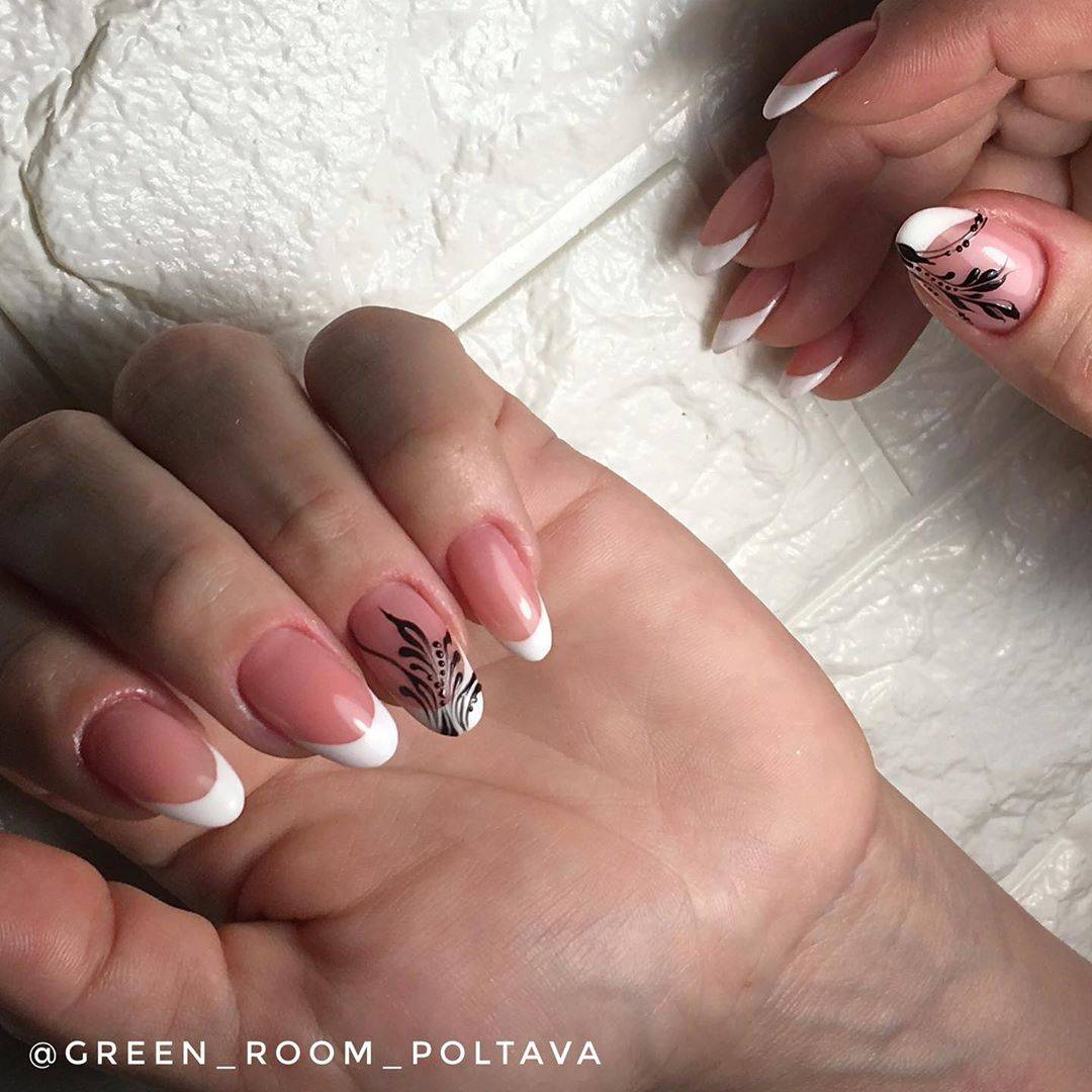 Черный и белый используются только для декора «улыбки» френча, остальное пространство ногтя покрывается прозрачным топом или светло-розовым цветом. «Улыбка» френча в черно-белом цвете отличается от классического варианта. Чтобы дизайн выглядел интересно, используйте двойную, смещенную, геометрическую форму «улыбки».