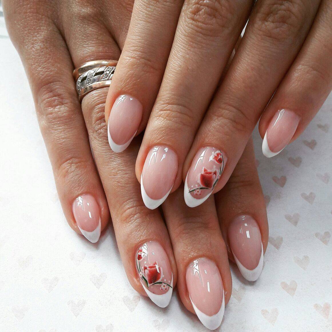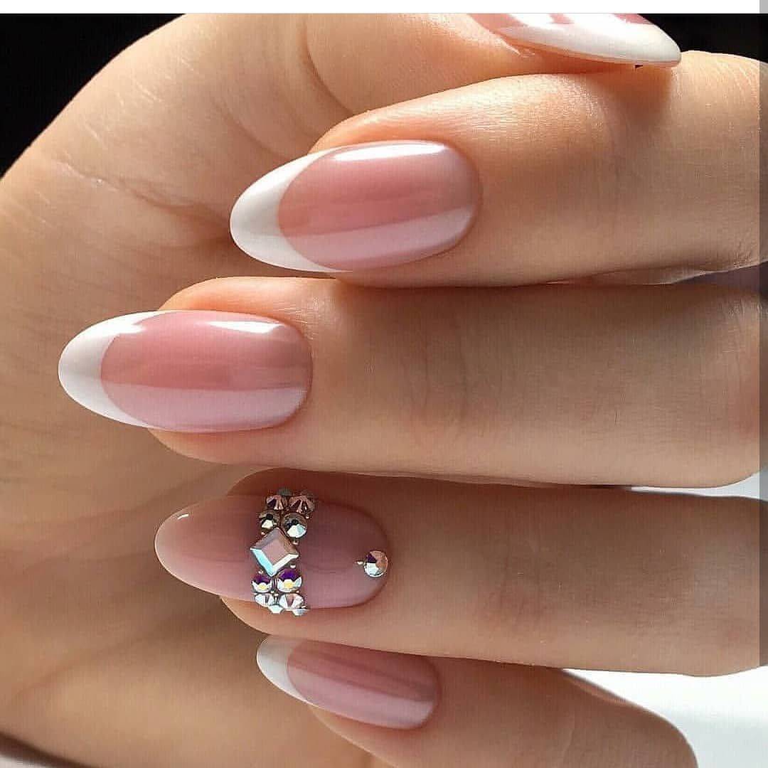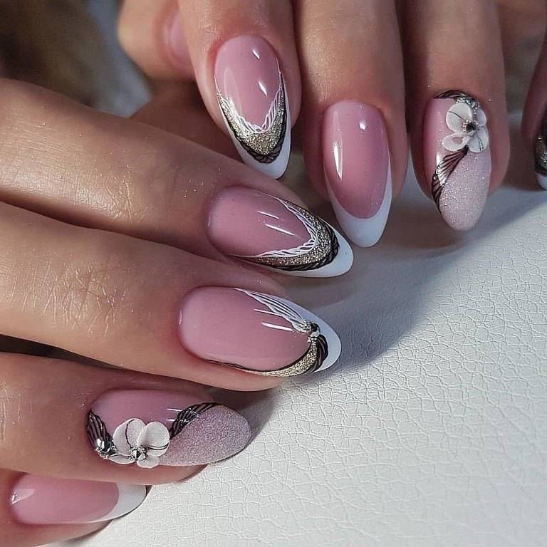 Форма миндаль или овал — одна из самых востребованных среди модниц. Это женственность и нежность. Для миндальной формы больше всего подходит классический вариант каемки. А вот дизайн может быть практически любым.