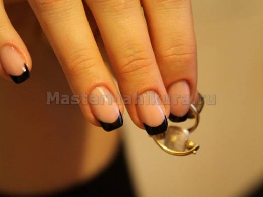 Лучше всего черный французский маникюр подходит обладательницам длинных, а также ногтям средней длины. Объясняется это вполне элементарно: лак этого цвета визуально уменьшает размеры не только в одежде. И если нанести темный лак на узкую полоску ногтя, он станет еще меньше и нужный эффект достигнут не будет. Такой французский маникюр хорошо смотрится на всех формах, начиная от классической овальной и заканчивая экстравагантной треугольной.