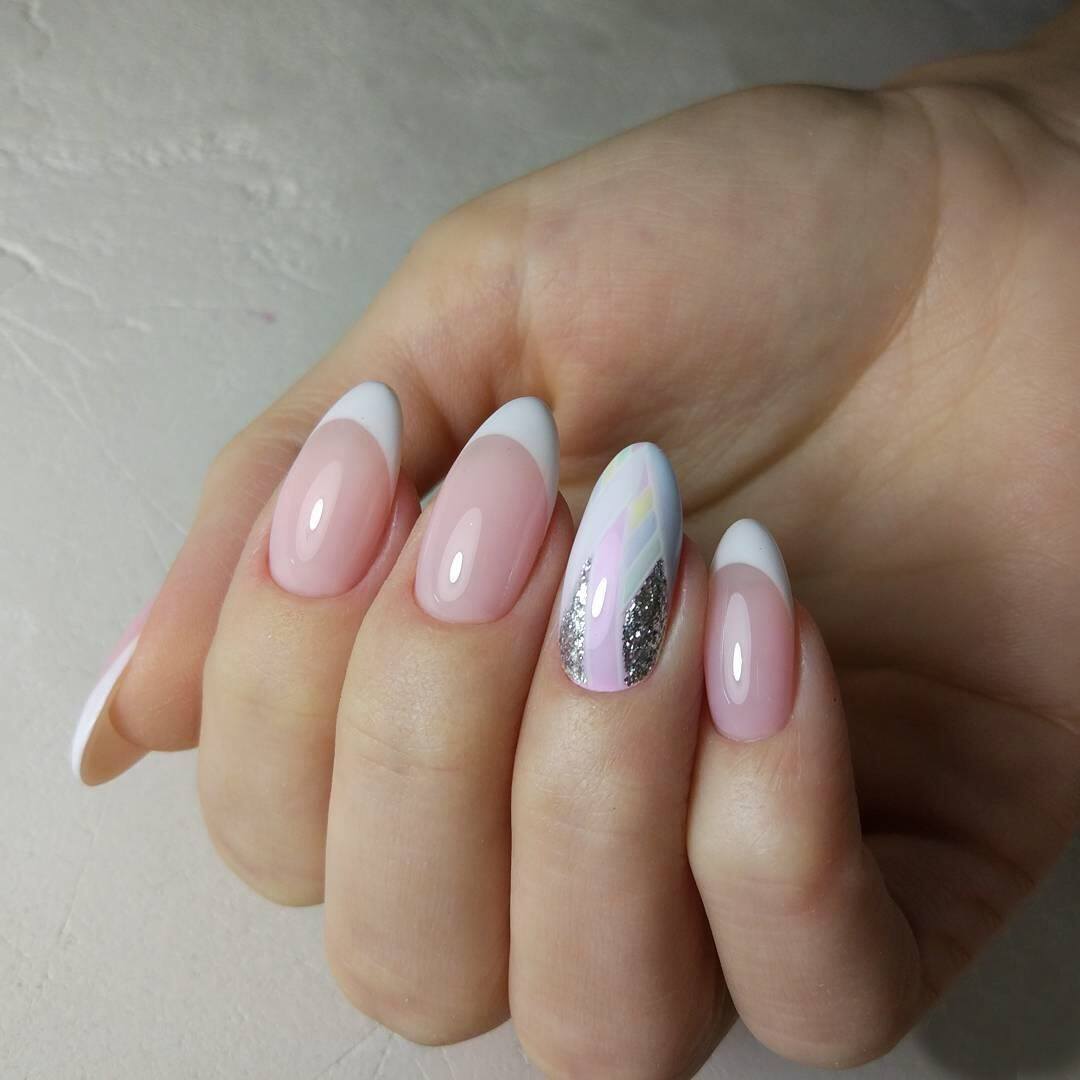К примеру, разноцветный или жемчужный пигмент, который нанесён поверх оформления, даже в комбинации с бесцветной основой, делает классический френч более интересным, свежим и невесомым.