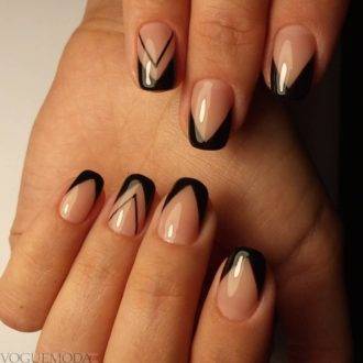 Этот френч, в отличие от классического белого, имеет некоторые ограничения по форме улыбки. Традиционная, более или менее глубокая, смотрится всегда органично, то же самое можно сказать о форме ромба с вершиной посередине, а также об угловом оформлении, когда полоска черным рисуется по диагонали. Черный френч должен иметь вытянутую форму, а рисунков улыбок, стремящихся к кутикуле, следует избегать: они только укоротят ноготь и сделают его шире.