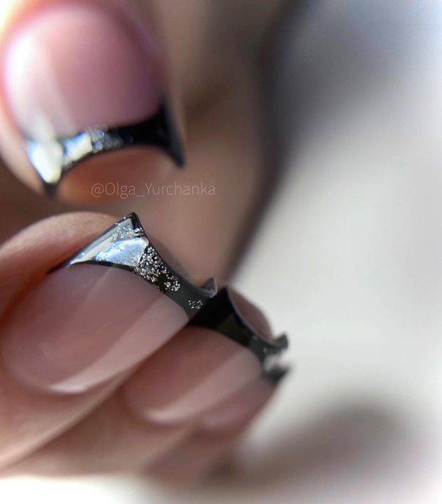 Абсолютный хит в дизайне черного френча – техника «Миллениум». Ее суть заключается в использовании перламутрового лака, блесток или микропудры в украшении улыбки. Идеальный последний штрих к вечернему образу!