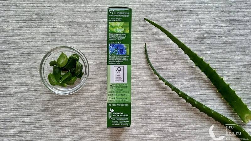 Крем поставляется в красивой зеленой коробочке с изображенными кусочками Алоэ