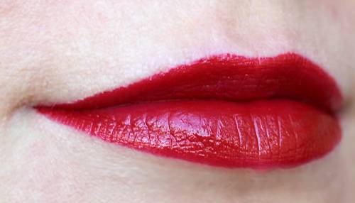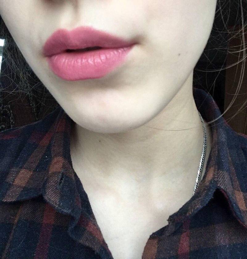 И кстати, именно на этом оттенке мне выпало случайно начать красить губы, когда они немного подсохли — то есть условия для испытаний были критические. И вот какой отличный результат.
