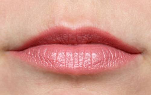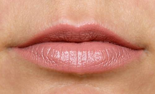 Текстура мягкая эластичная, в меру кремовая с голубоватыми блестящими вкраплениями. На выходе получается нежное «атласное» покрытие с приглушенным мерцающим блеском. Тон хорошо наслаивается, консистенция не капризная, не требует обязательного применения контурного карандаша. Хорошо наслаивается, при ее нанесении блестящие компоненты чувствуются, но не вызывают дискомфорта. После одного слоя губы приобретают нежный оттенок. Чтобы получить более насыщенный цвет, понадобится наложить еще один слой.