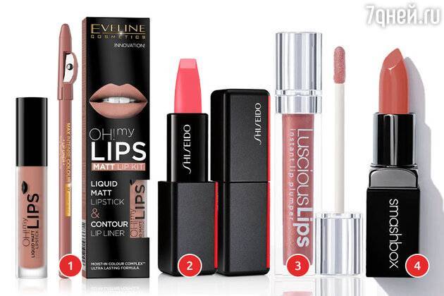 1. Набор Oh! My Lips Matt Lip Kit Eveline Cosmetics. 2. Помада Modern Matte Shiseido. 3. Бальзам-пламперы для губ Luscious Lips. 4. Помада Be Legendary Smashbox.