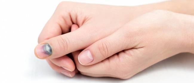 Одной из самых распространенных причин изменения цвета ногтя на ноге или руке остается травмирование пластины. Это может быть удар пальцем о что-нибудь, как следствие, происходит постепенное изменение окраса, спровоцированное лопнувшим сосудом. Изменение окраса ногтя на черный из-за травмы является не чем иным, как обычный кровоподтек (синяк). Для представительниц слабого пола достаточно незначительного ушиба, чтобы образовалось потемнение.