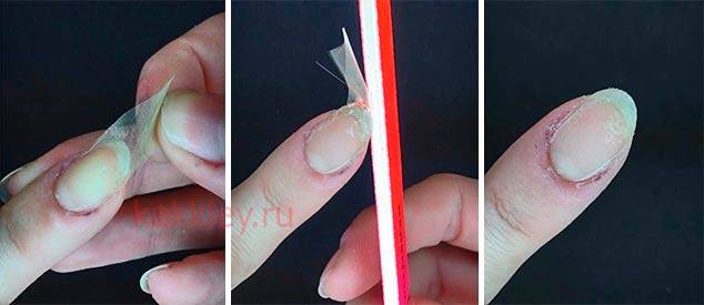 Шаг 4. Подпиливаем, если шелк или материал немного выступает за края ногтевой пластины.