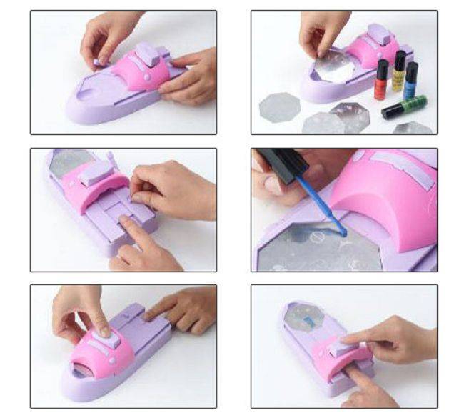 Для этого головка с печатью перемещается к палитре с рисунком и нажимается специальной кнопкой. После этого рисунок, который уже оказался на поверхности валика, переносится на ноготь. Для этого достаточно передвинуть печатную головку к ногтю и нажать на механизм еще раз. Как видите, все инструменты просты в использовании.