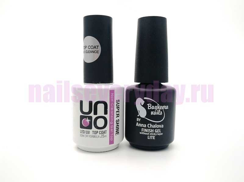 Для максимально чистого и свежего френча, а также белого и всех светлых оттенков заведите сильно синящий топ с УФ-фильтрами. Например, без л/с: Bagheera Nails B-5 Lite или Uno Supershine. Для черного, темных и ярких цветов выбирайте топ без УФ-фильтра, который может немного желтить — это будет незаметно. Например, топ с л/с NeoNail Hard Top.