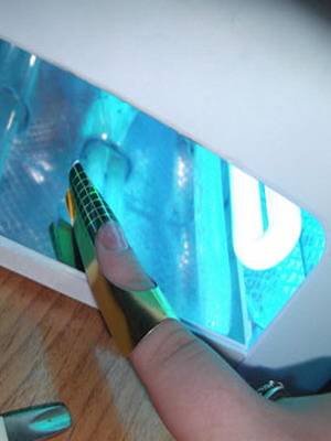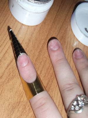После выполнения подготовительных операций необходимо надеть формы. Для этого передний вырез формы заводится под свободный край ногтя. Далее форму закрепляют и придают ей форму и изгиб, наиболее соответствующий форме натурального ногтя. Если эти правила не будут соблюдены, носить ногти будет неудобно, кроме того, неестественный изгиб арки искусственного ногтя после усадки материала может повредить натуральную ногтевую пластину.