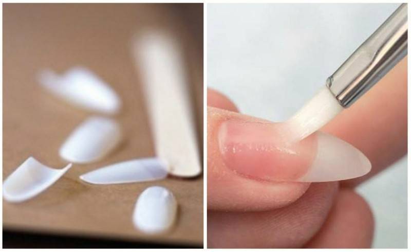 Наращивание ногтей акрилом на типсах подразумевает аналогичную технологию с применением всех составляющих компонентов. В процессе потребуются пластиковые, прозрачные типсы, клей, щипцы для придания ноготкам формы.