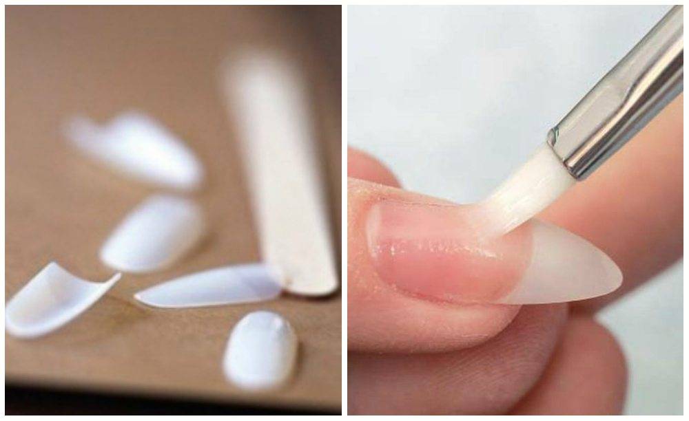 Наращивание ногтей акрилом на типсах подразумевает аналогичную технологию с применением всех составляющих компонентов. В процессе потребуются пластиковые, прозрачные типсы, клей, щипцы для придания ноготкам формы.