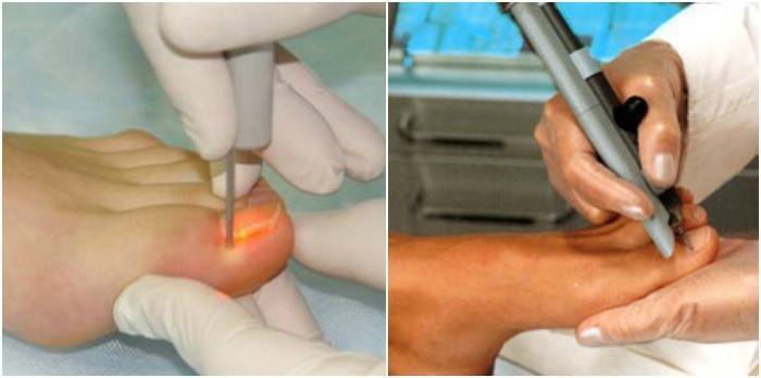 - Удаление вросшего ногтя при помощи лазера. Лазер эффективен в тех случаях, когда имеются грибковые заболевания, потому что лазер уничтожает споры грибковой инфекции.