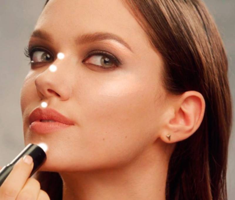 Середина лба. С хайлайтером она становится выпуклой, что визуально принимается как признак молодости. Ширина светового пятна способна визуально сузить или расширить высоту и ширину лба.Уголки глаз с внутренней стороны. Нанесение хайлайтера на переносицу и эти зоны визуально раздвигает близко посаженные глаза и утончает переносицу. Благодаря этому вы скроете следы усталости.Зона под бровью или над бровью. Вы подчеркнете дугу бровей, визуально приподнимете их и сделаете взгляд открытым. Косметика скрывает маленькие волосики, которые выбиваются из общей массы.Спинка носа. Наносится прямой линией, благодаря чему часть лица становится тоньше и изящнее. С его помощью можно создать эффект вздёрнутого носа, если провести короткую полоску. Если провести полоску до конца, нос станет визуально длиннее.