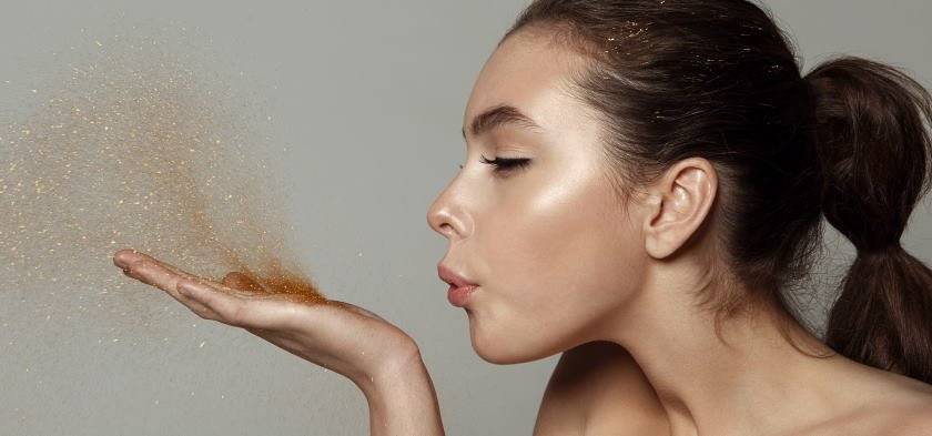 Мерцающие частицы незаменимы для девушек с жирной кожей. Схема нанесения такого хайлайтера на лицо весьма сложная и придется потренироваться. Нужно сделать так, чтобы он не забивал поры и не ухудшал имеющиеся воспаления. Излишки обычно удаляют кистью. После него тело наполняется свежестью, выглядит ухожено.