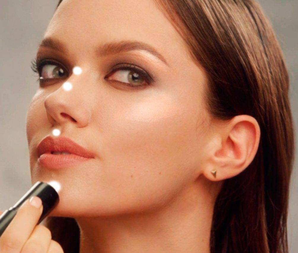 Середина лба. С хайлайтером она становится выпуклой, что визуально принимается как признак молодости. Ширина светового пятна способна визуально сузить или расширить высоту и ширину лба.Уголки глаз с внутренней стороны. Нанесение хайлайтера на переносицу и эти зоны визуально раздвигает близко посаженные глаза и утончает переносицу. Благодаря этому вы скроете следы усталости.Зона под бровью или над бровью. Вы подчеркнете дугу бровей, визуально приподнимете их и сделаете взгляд открытым. Косметика скрывает маленькие волосики, которые выбиваются из общей массы.Спинка носа. Наносится прямой линией, благодаря чему часть лица становится тоньше и изящнее. С его помощью можно создать эффект вздёрнутого носа, если провести короткую полоску. Если провести полоску до конца, нос станет визуально длиннее.