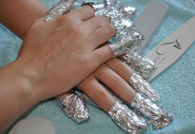 После того как прошло нужное время, фольгу необходимо снять и убрать остатки размоченного гель лака при помощи пушера.