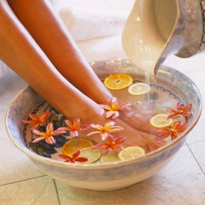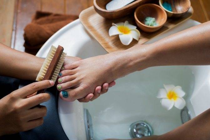 Этот этап проводится из двух соображений: во-первых, чтобы очистить ноги клиента, во-вторых, чтобы размягчить и успокоить кожу ног. В воду обычно добавляют морскую соль или различные эфирные масла.