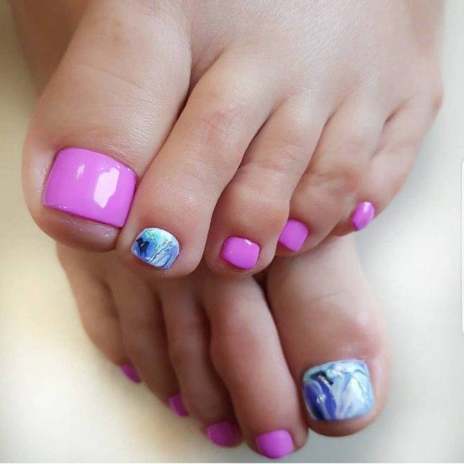 К идеальному дизайну педикюра 2021-2022 мы не можем не отнести френч. Белая полоска придает ноготкам очарования и элегантности. В этом сезоне модный французский педикюр удивит модниц контрастными вариантами с фиолетовой, пурпурной или синей основой.