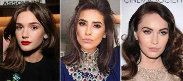 на средних и длинных волосах хорошо смотрятся, все оттенки золота и каштана. При этом акцент стоит сделать на губах;