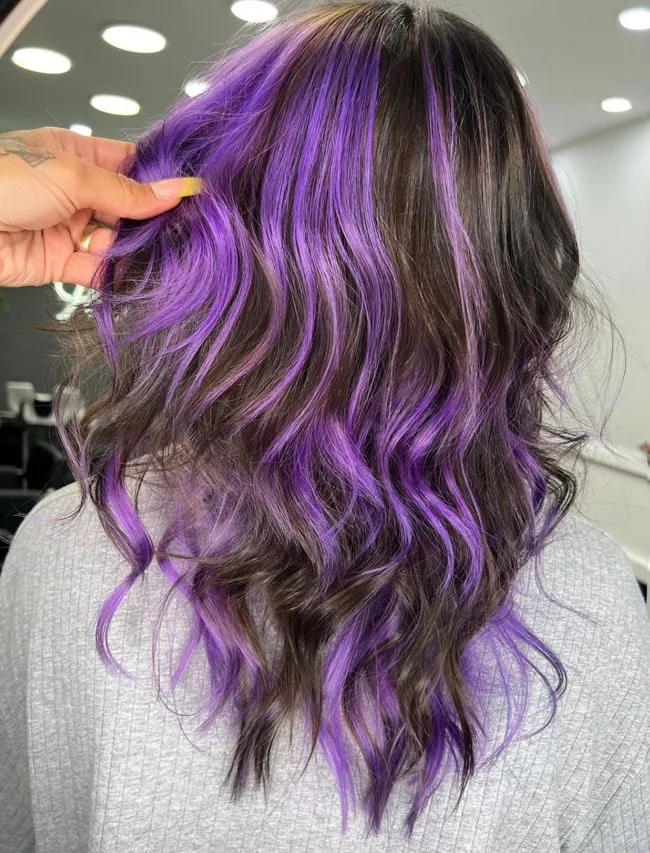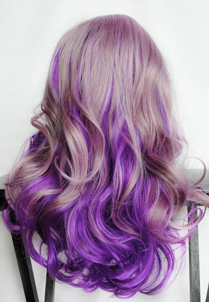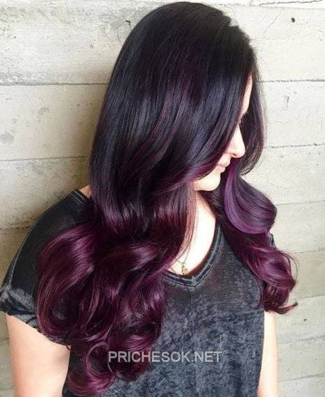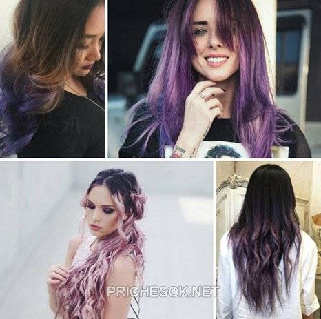 Длинные черные локоны особенно эффектно выглядят в сочетании с лиловым или фиолетовым низом.
