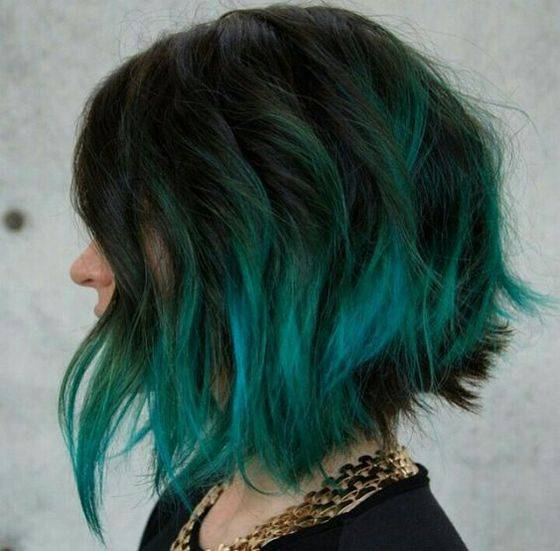 В общем и целом цветное омбре на темные волосы применяется на шевелюрах любой длины. Особенно популярным является совмещение тренда с другой модной тенденцией, а именно стрижкой длинный боб. Прическа сама по себе выглядит стильно и женственно, в различных цветовых комбинациях смотрится еще и экстравагантно.