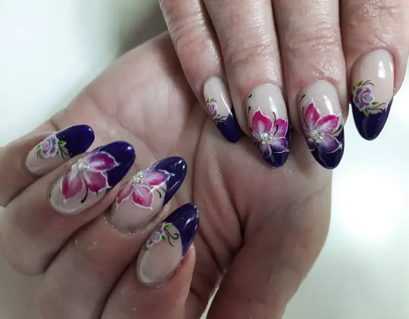 Цветочные узоры всегда радуют глаза дам. Их красотой невозможно не восхищаться. С ними цветной френч выглядит особенно нежно и лаконично. Такое оформление чаще всего выбирают романтичные натуры в весенне-летний период. Здесь актуально будет добавить немного страз или мелких блесток. Получится создать более насыщенный дизайн.